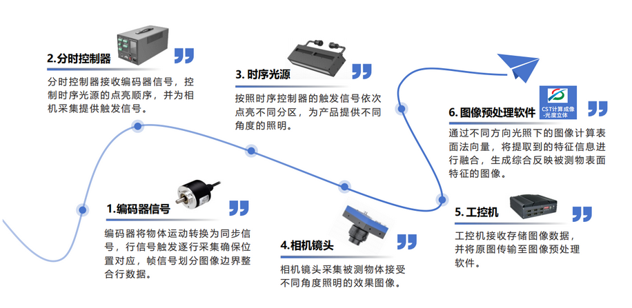 線陣光度立體成像系統(tǒng)采用光度立體視覺(jué)技術(shù),通過(guò)多角度光照協(xié)同與陰影成像原理,可實(shí)現(xiàn)對(duì)物體表面三維形貌重構(gòu)。系統(tǒng)在單次掃描中同步獲取4張不同光照條件下的圖像序列,結(jié)合算法重建物體表面法線分布圖,特別適用于檢測(cè)漫反射材料表面細(xì)微缺陷。本系統(tǒng)通過(guò)模塊化設(shè)計(jì),集成了工業(yè)級(jí)圖像采集組件與智能預(yù)處理單元,為制造業(yè)提供非接觸式、高精度的表面質(zhì)量檢測(cè)解決方案。