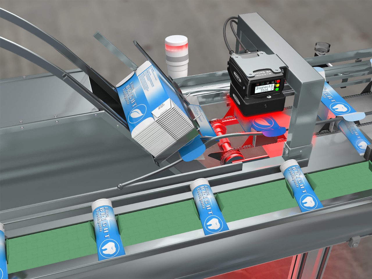 在裝入牙膏管之前,VE系列智能相機會事先檢查每個盒子上的產品標志。當盒子進入檢查區(qū)域時,生產線上的