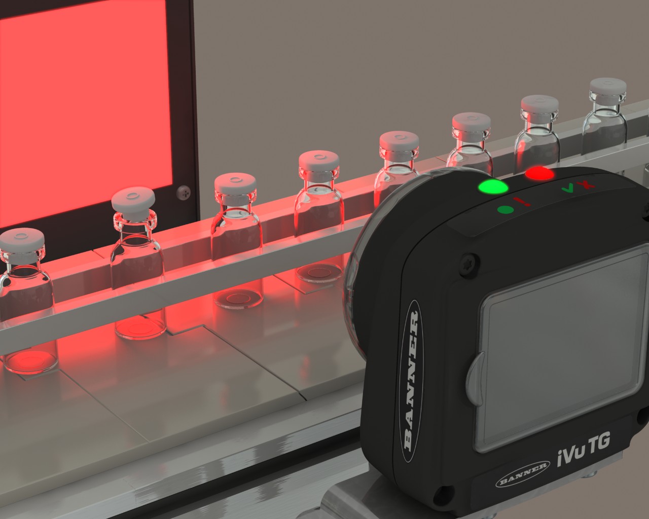 為了確保在每個(gè)瓶子離開灌裝站時(shí)正確插入瓶塞,使用定位功能和Area工具的iVu系列傳