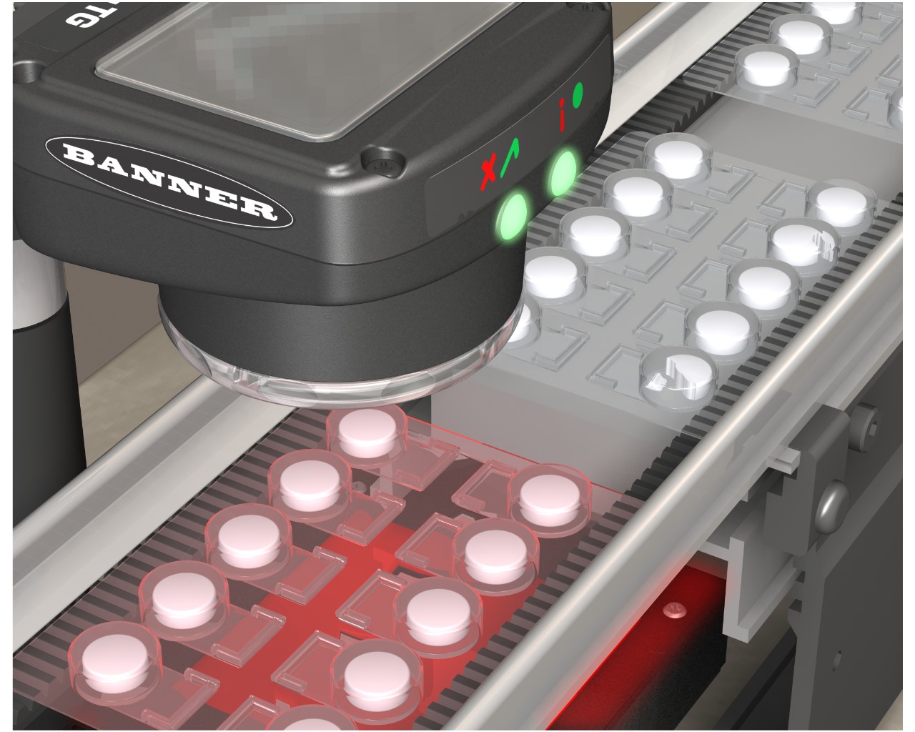 要檢驗包裝中的每個泡罩,可以使用配置為Area檢測工具的iVu系列傳感器。該款傳感