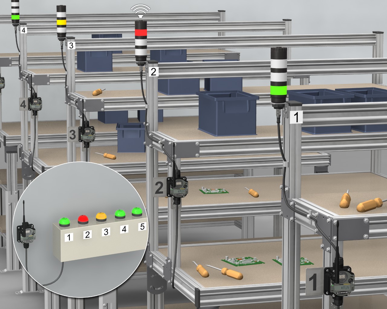 每個(gè)工作單元位置的無(wú)線I/O節(jié)點(diǎn)、燈和按鈕讓工人能在不離開工作站的情況下呼叫補(bǔ)給更多零部件。