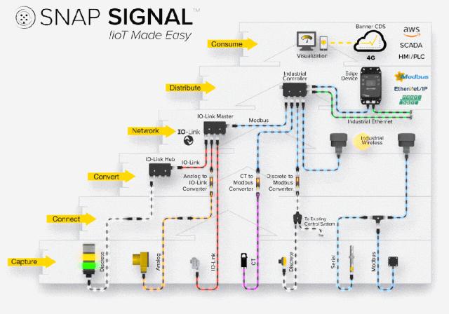 在邦納的IIoT產(chǎn)品組合的核心是Snap Signal,一個(gè)能提供實(shí)用機(jī)械數(shù)據(jù)的模塊化軟硬件套件。數(shù)據(jù)信號(hào)幾乎可以從任何制造商的任何新的或現(xiàn)有的來源捕獲,并且轉(zhuǎn)化成工業(yè)標(biāo)準(zhǔn)協(xié)定。然后,為了方便使用,可以把數(shù)據(jù)分配到本地,企業(yè)網(wǎng)絡(luò)或者云端。這樣就能完成并簡(jiǎn)化諸如數(shù)據(jù)采集,分析,以及可視化這些復(fù)雜的工作。因?yàn)镾nap Signal可以整合在工廠內(nèi)的所有傳感信號(hào),所以邦納可以建立一個(gè) I/O系統(tǒng),充分利用新舊設(shè)備提供的豐富數(shù)據(jù)。